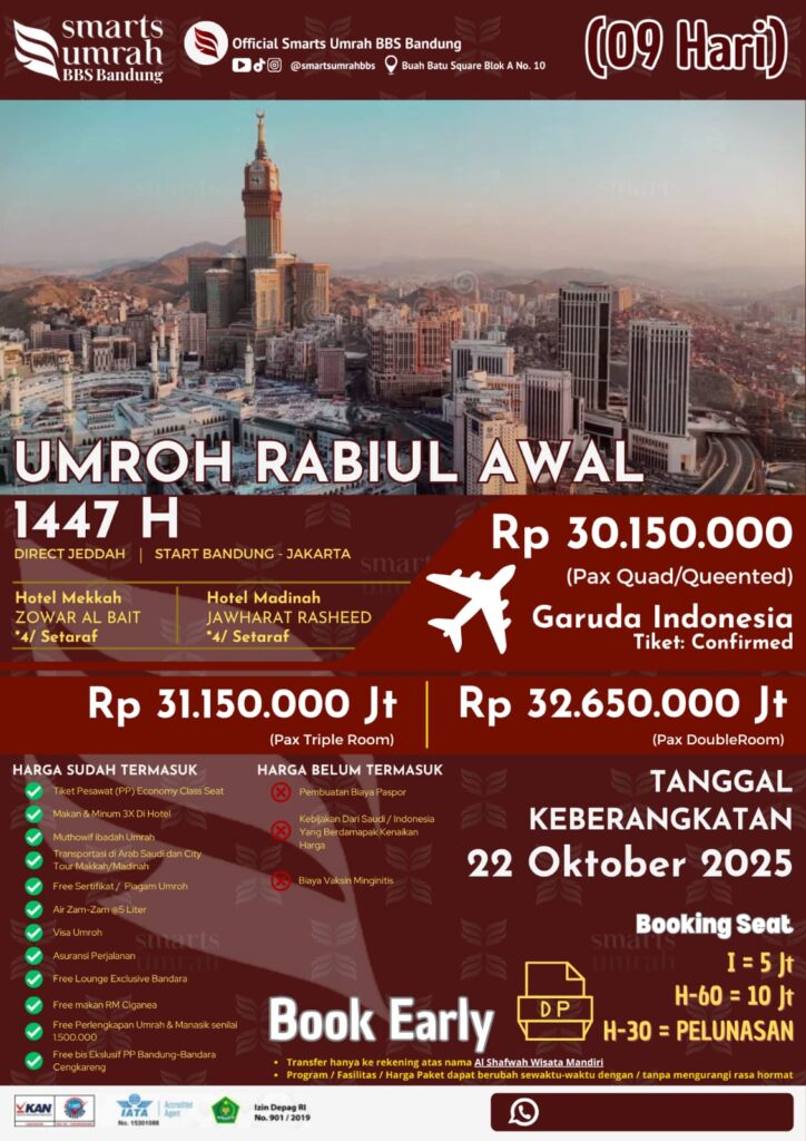 Rayakan bulan kelahiran Nabi Muhammad SAW dengan penuh kekhusyukan melalui Paket Umroh Rabiul Awal 1447 H (9 Hari) dari Smarts BBS Bandung, berangkat pada 22 Oktober 2025 menggunakan maskapai Garuda Indonesia. Perjalanan ini memberikan Anda kesempatan istimewa untuk memperdalam kecintaan kepada Rasulullah dengan menunaikan ibadah Umroh di bulan yang penuh keutamaan. Didampingi oleh pembimbing berpengalaman dan didukung fasilitas terbaik, Anda akan menjalani ibadah yang tenang, nyaman, dan penuh makna. Jadikan momen Rabiul Awal sebagai waktu terbaik untuk memperkuat iman dan meraih keberkahan di Tanah Suci.
